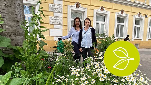 Stadtteilgärtnerinnen Petra und Edith zeigen wie sie mit ihrer Baumscheibe zu mehr Artenvielfalt im Grätzl beitragen! Mach mit und beantrage deine Baumscheibe!